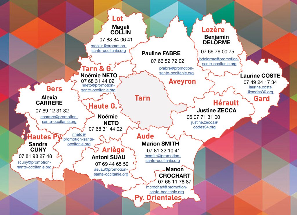 Afin d’être soutenu dans l’organisation d’actions de proximité : aide à la commande d’outils, à la recherche d’intervenants, identification de ressources et d’outils, appui à l’élaboration du projet (rédaction des objectifs, évaluation…), chaque partenaire peut se rapprocher d’un référent territorial Promotion Santé Occitanie (voir les contacts par département ci-dessous) :
