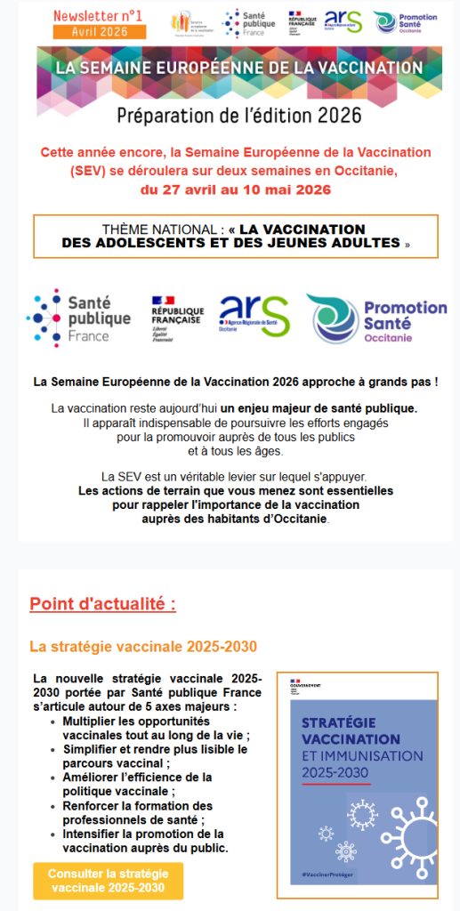 L’ARS Occitanie et Promotion Santé Occitanie réalisent et diffusent depuis de nombreuses années des newsletters régionales spécifiques à la Semaine Européenne de la Vaccination.