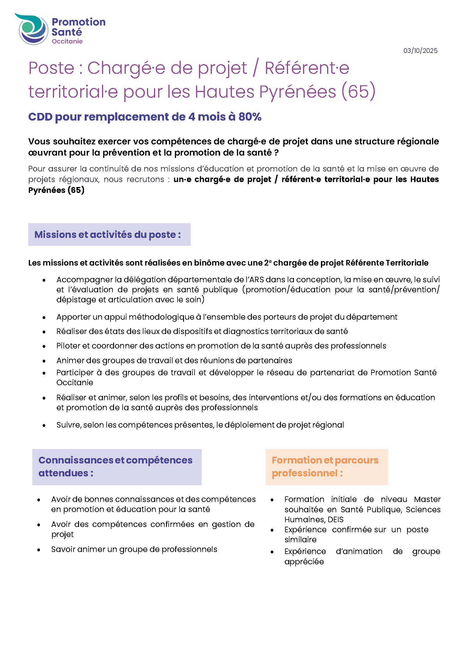 Home » Offre d’emploi : Chargé·e de projet / Référent·e territorial·e pour les Hautes Pyrénées (65)